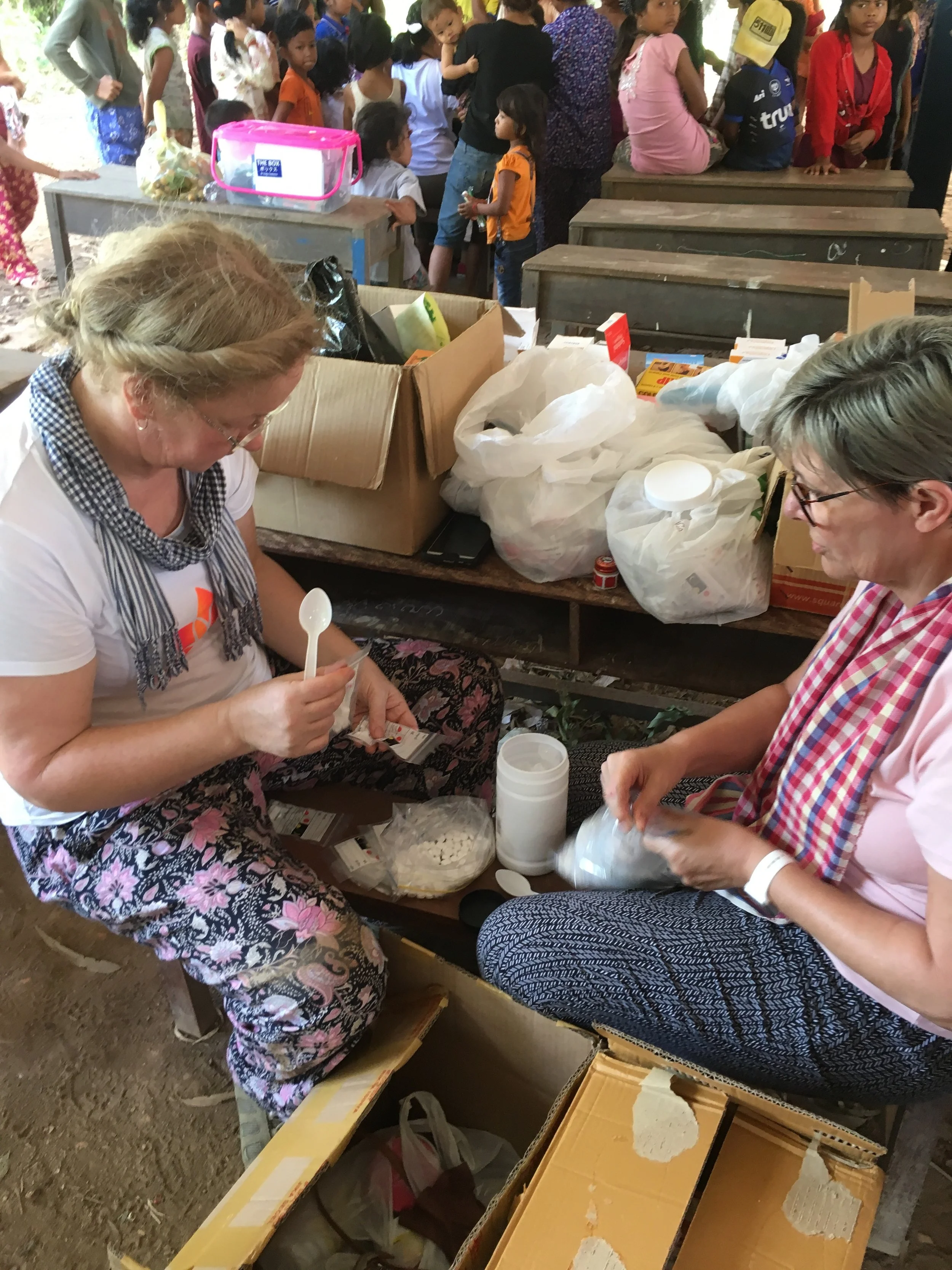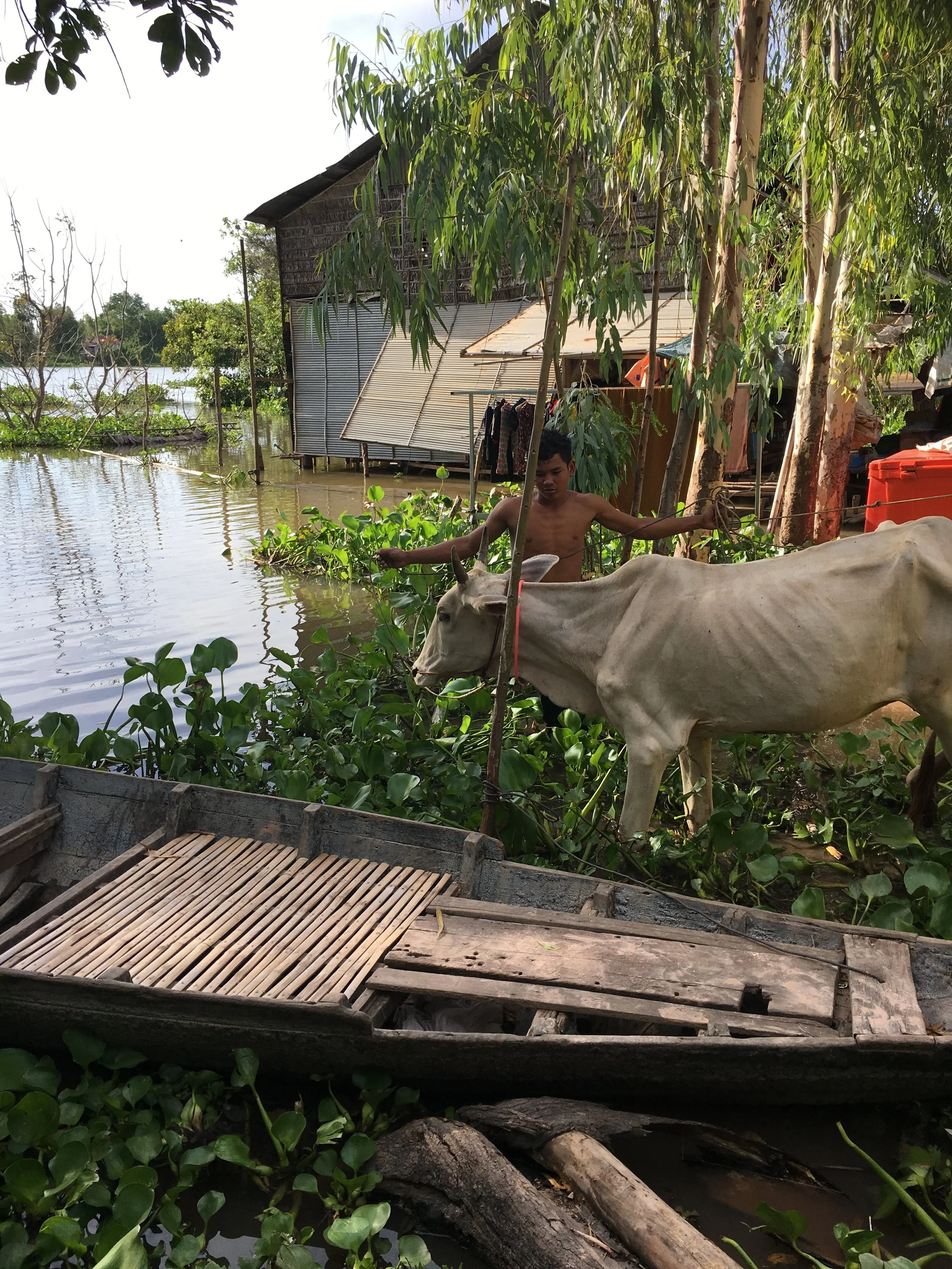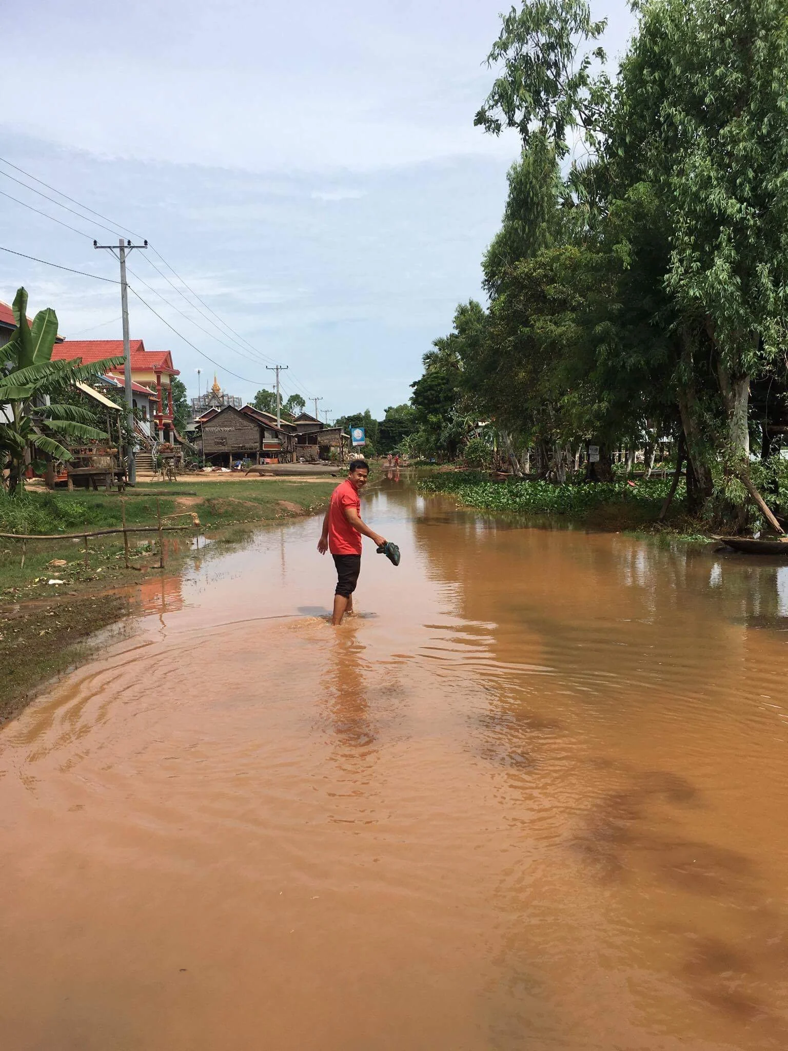 Our first clinic in keeping to CWC tradition was planned by Sarorn. This was a new village which we were advised was approximately an hour and a half from the city and a very short ferry trip over the Tonle Sap river to a small (tik tik) highland area of land which was very isolated. The village was called Piam Pich and is located in a commune of eleven villages in total. Our journey there took an unexpected turn due to the very wet weather and on 2 occasions Sarorn needed to walk the road through water and ensure we were safe to pass. Our canny van driver negotiated the tiny, slippy roads to make sure we arrived at the ferry stop safely.